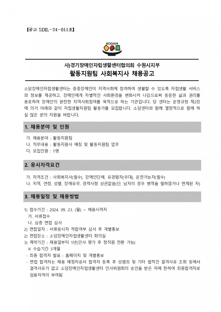2024 활동지원팀 사회복지사 채용 공고의 건