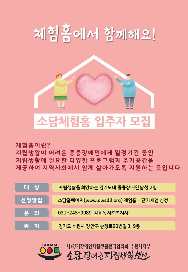 신청방법 :소담장애인자립생활센터 홈페이지(www.swsdil.org) 에서 체험홈 단기체험 신청란에 작성