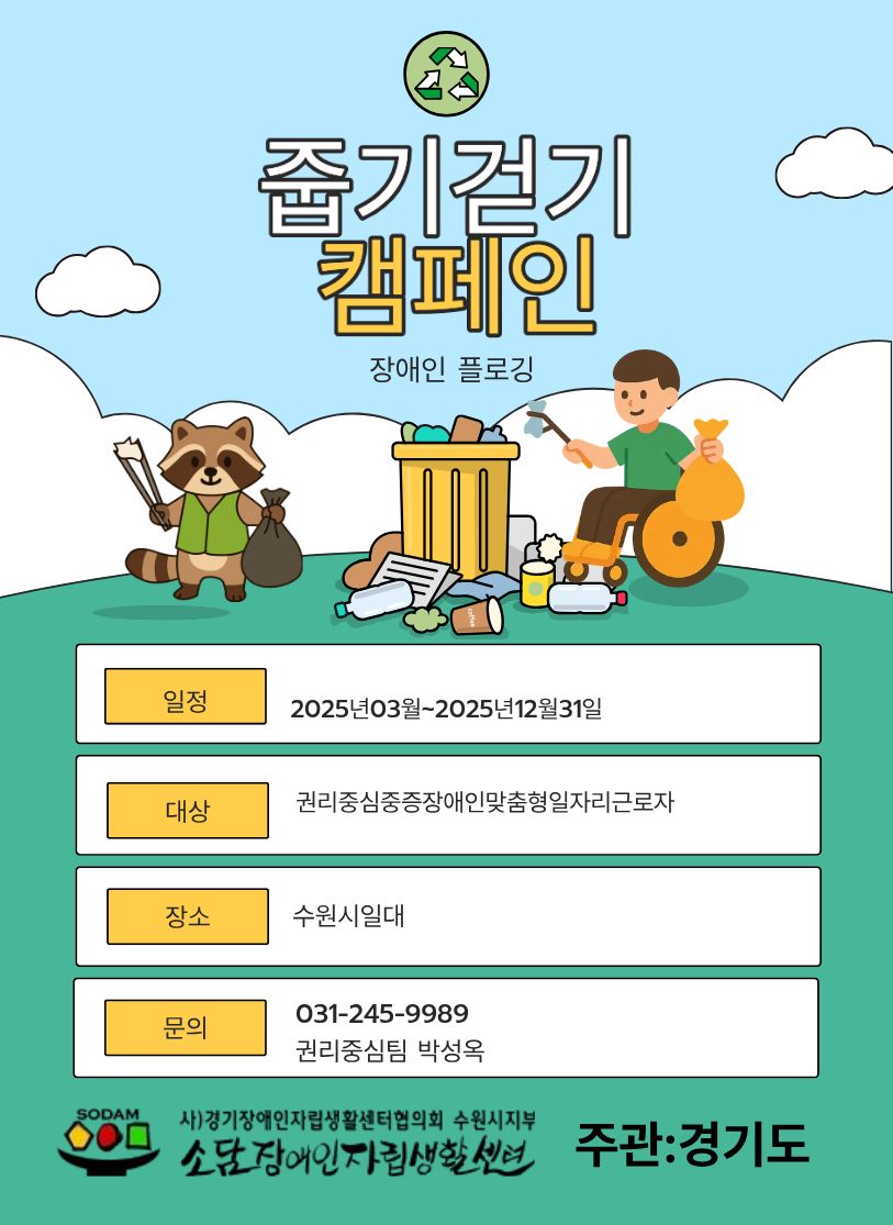 0220 기후 위기 극복을 위한 지역사회 플로깅 참여자 모집 페이지 정보 작성자 소담센터 댓글 0건 조회 61회 작성일 25-02-20 22:02 본문 지역사회 장애인들의 많은 참여부탁드립니다. 목록 이전글0220 권리 를 알리는 국악 풍물 참여자 모집 25.02.20 다음글2026년 자립생활지원팀 활동가 채용 수정 공고 26.01.05 댓글목록 댓글목록 등록된 댓글이 없습니다.