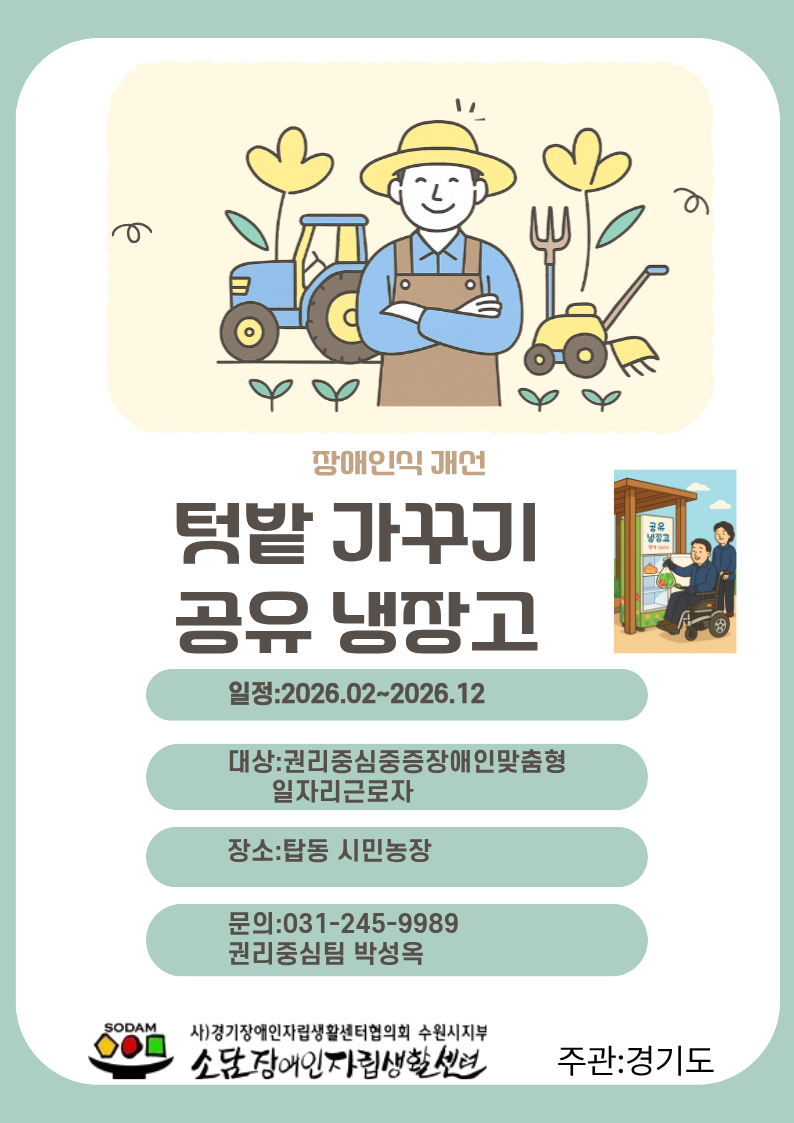 0120 텃밭가꾸기 & 공유냉장고 기부사업 참여자 모집합니다. 페이지 정보 작성자 소담센터 댓글 0건 조회 66회 작성일 26-01-28 00:21 본문 지역장애인들의 많은 관심 부탁드립니다. 목록 이전글0120 권리를 디자인하다 미술 참여자를 모집합니다. 26.01.28 다음글0120 지역사회 캠페인 참여자를 모집합니다. 26.01.28 댓글목록 댓글목록 등록된 댓글이 없습니다.