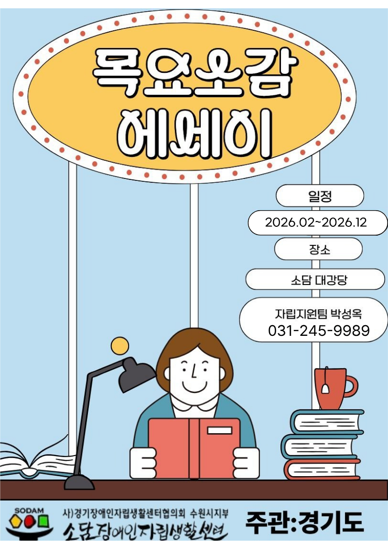0120 소감문 에세이 참여자 모집합니다. 페이지 정보 작성자 소담센터 댓글 0건 조회 63회 작성일 26-01-28 00:23 본문 지역장애인들의 많은 관심과 참여 부탁드립니다. 목록 이전글0120 권리 댄스 참여자 모집합니다. 26.01.28 다음글0120 권리를 디자인하다 미술 참여자를 모집합니다. 26.01.28 댓글목록 댓글목록 등록된 댓글이 없습니다.