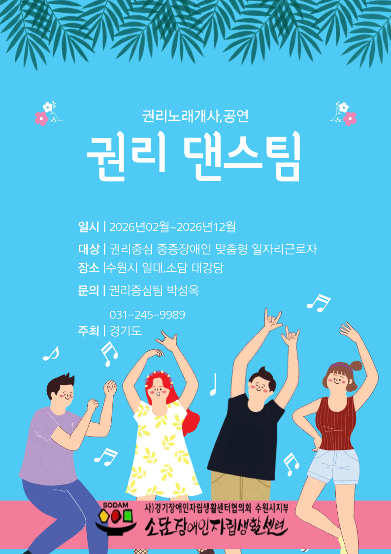 0120 권리 댄스 참여자 모집합니다. 페이지 정보 작성자 소담센터 댓글 0건 조회 72회 작성일 26-01-28 00:25 본문 지역장애인들의 많은 관심과 참여를 바랍니다. 목록 이전글0120 장애인미디어교육 참여자를 모집합니다. 26.01.28 다음글0120 소감문 에세이 참여자 모집합니다. 26.01.28 댓글목록 댓글목록 등록된 댓글이 없습니다.