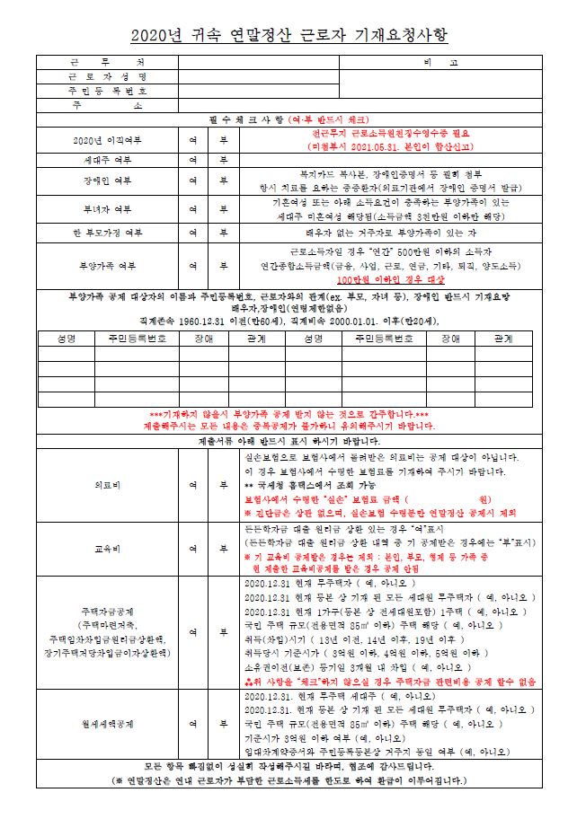 연말정산 공제항목 안내 / 근로자기재요청사항 페이지 정보 작성자 소담센터 댓글 1건 조회 2,618회 작성일 21-01-13 16:19 본문 첨부파일 연말정산 근로자기재사항.pdf (91.9K) 237회 다운로드 | DATE : 2021-01-20 11:29:35 목록 이전글2021년 1월 활동지원사 월례교육 21.01.27 다음글연도전환 / 단말기 업그레이드 안내 20.12.23 댓글목록 댓글목록 김연순님의 댓글 김연순 작성일 21-01-20 20:11 안녕하세요.^^ 답변 삭제 안녕하세요.^^