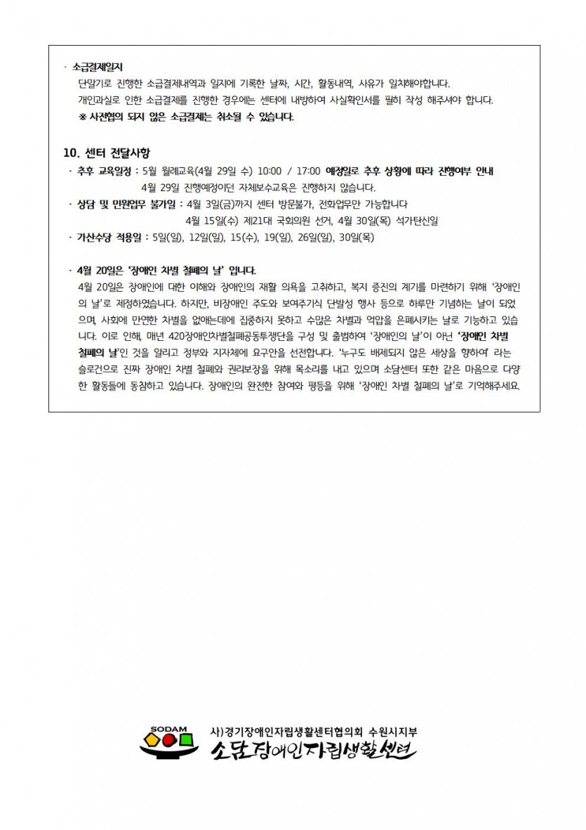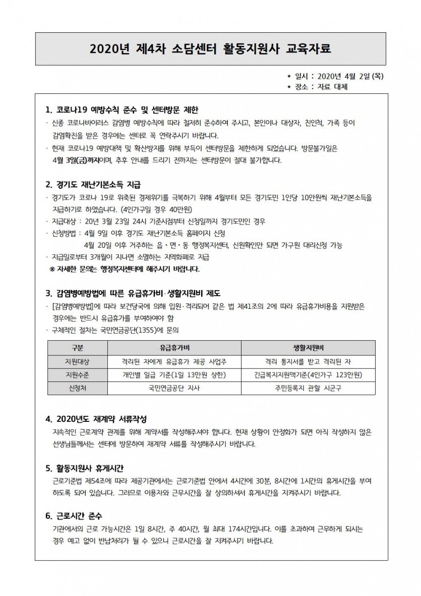 4월 활동지원사 월례교육 페이지 정보 작성자 소담센터 댓글 0건 조회 1,786회 작성일 20-04-01 15:52 본문 강도높은 사회적 거리두기를 실천하기 위해 4월 교육은 자료로 대체합니다. 목록 이전글재난기본소득 신청안내 20.04.10 다음글코로나19 감염병 예방 행동수칙 20.03.02 댓글목록 댓글목록 등록된 댓글이 없습니다.