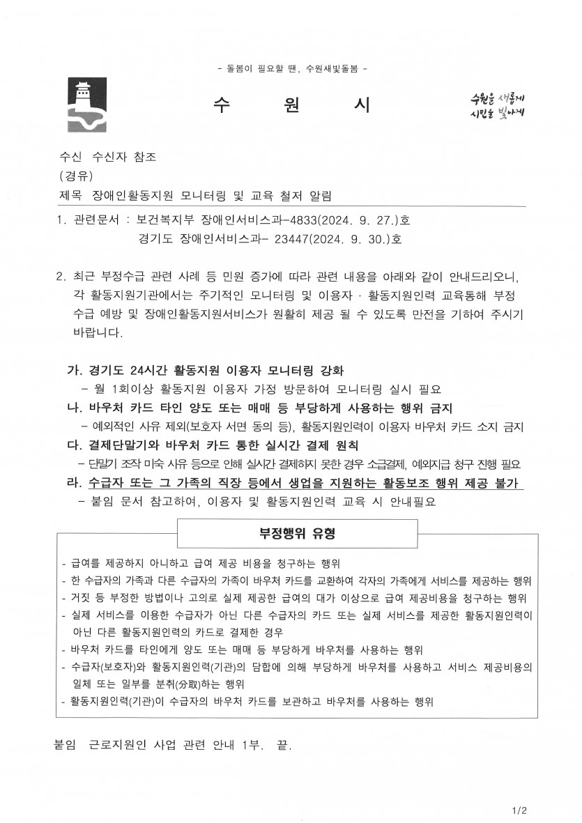 ※ 최근 부정수급 관련 사례 등 민원증가에 따라 관련 내용을 안내해드리오니 이용자 및 활동지원사 분들께서는