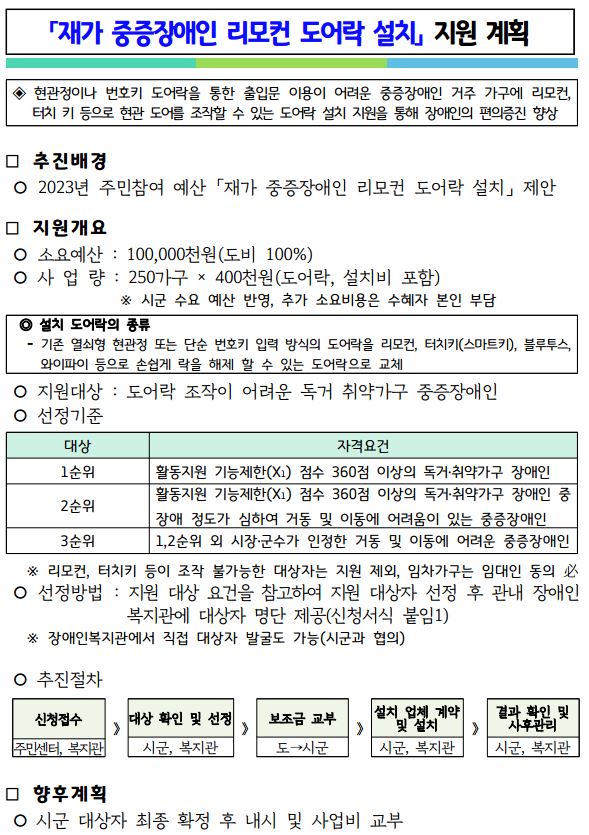 재가 중증장애인 리모컨 도어락 설치 지원 페이지 정보 작성자 소담센터 댓글 2건 조회 848회 작성일 23-04-05 16:27 본문 ※ 자세한 사항은 센터로 문의해주세요 첨부파일 서식 및 신청서수정.hwp (85.5K) 55회 다운로드 | DATE : 2023-04-05 16:27:19 목록 이전글장애 청소년 장학사업 안내 23.04.07 다음글2023년 3월 활동지원사 월례교육 23.03.28 댓글목록 댓글목록 유동현님의 댓글 유동현 작성일 23-04-05 18:04 댓글내용 확인 답변 삭제 비밀글 입니다. 이동철님의 댓글 이동철 작성일 23-04-08 22:30 도어락신청합니다 답변 삭제 도어락신청합니다