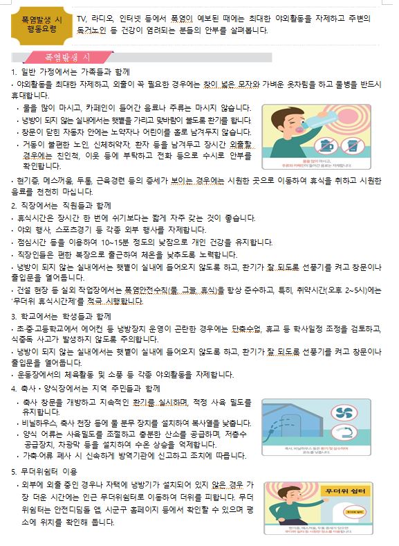 2023년 재가장애인 폭염 피해 대응 계획안내 페이지 정보 작성자 소담센터 댓글 2건 조회 736회 작성일 23-06-21 15:06 본문 여름철 평균기온 상승으로 취약 장애인의 폭염피해를 예방하고자 안내사항 및 대응 계획 공지드립니다. 목록 이전글2023년 6월 활동지원사 월례교육 23.06.28 다음글경기도 장애인 활동지원사 심리상담 신청 안내 (누림) 23.06.08 댓글목록 댓글목록 정정희님의 댓글 정정희 작성일 23-06-30 09:23 확인했읍니다 답변 삭제 확인했읍니다 이성무님의 댓글 이성무 작성일 23-06-30 09:31 확인했습니다 답변 삭제 확인했습니다