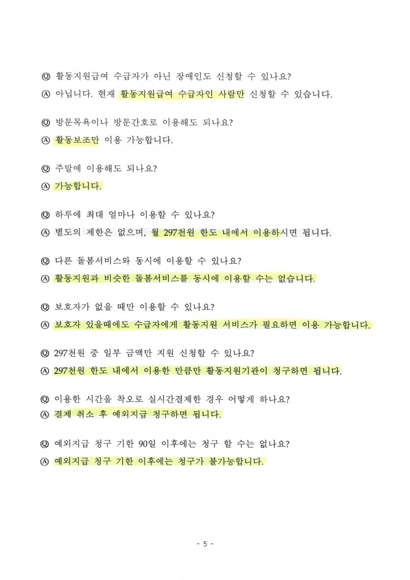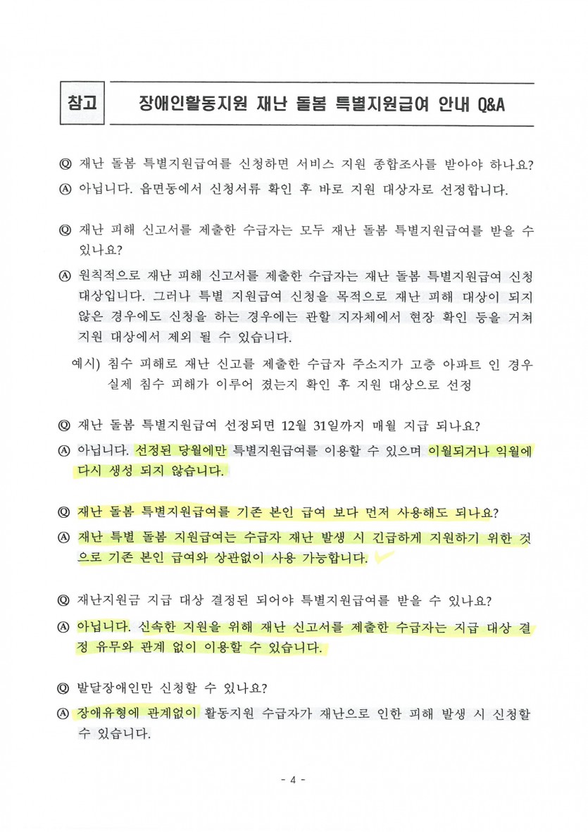 장애인활동지원 재난 돌봄 특별지원 급여 제공 안내(세부사항 및 Q&A)