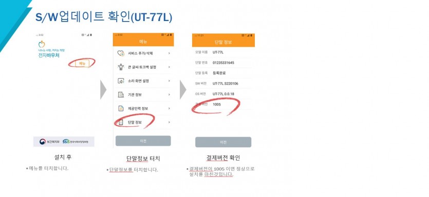 단말기 버전정보 UT-77L : 1005, UT-55L : 1010, VT-11 : 1025, 스마트폰 : 1029 이면 정상 설치
