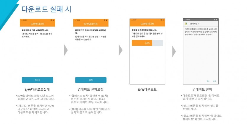 - 단말기 등록정보 자동 확인 → [SW 업데이트] 화면에서 [다운로드] 클릭 → [SW 업데이트] 진행 →